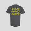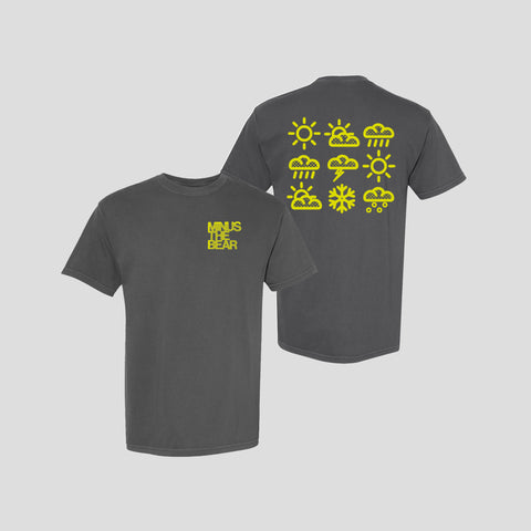 Celebrate 20 years of Menos el Oso with this exclusive weather icon tee—featuring the classic MTB logo on the front and custom artwork inspired by the album's mood and movement on the back. Printed on a soft-washed gunmetal tee with bright yellow graphics. Limited quantities available